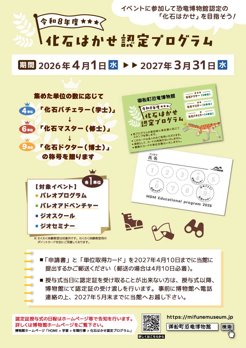 集めた単位数に応じて、【化石バチェラー】→【化石マスター】→【化石ドクター】の称号を授与します。称号を授与された方を対象に「化石はかせ認定プログラム認定証授与式」を行い、認定証と記念品を贈呈します(令和9年4月頃を予定しています)。